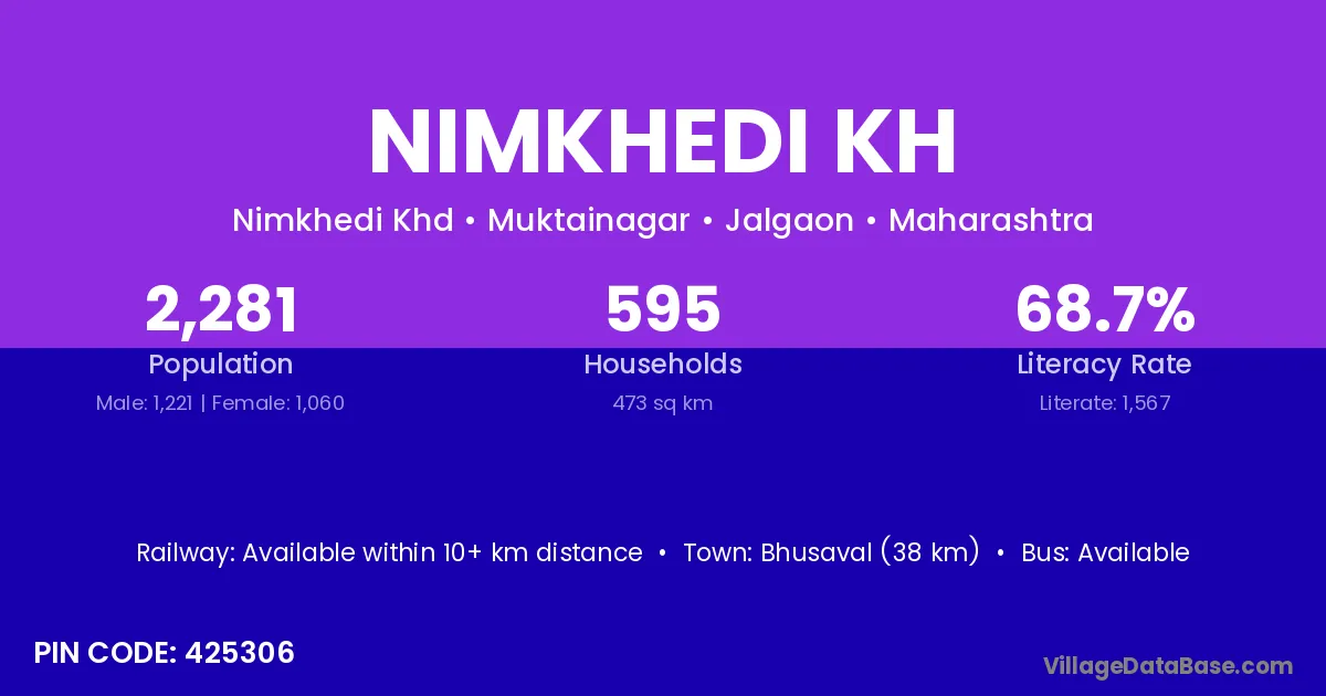 Bhusaval (38 km) is the nearest town to Nimkhedi Kh village for major economic activities and is located approximately 38 km away.