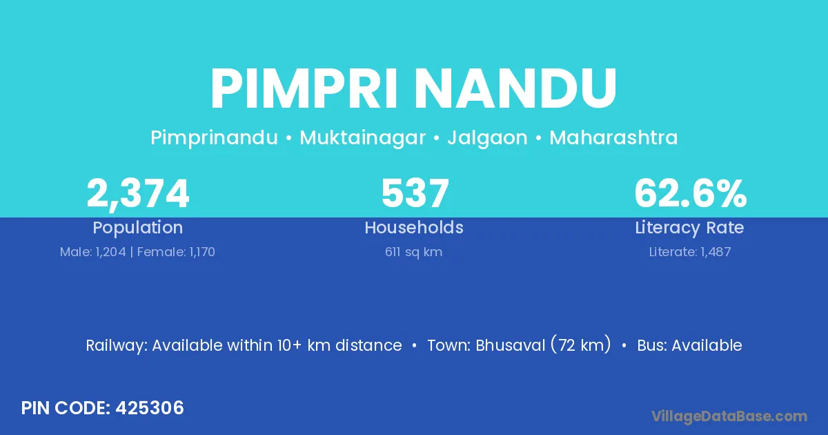 Bhusaval (72 km) is the nearest town to Pimpri Nandu village for major economic activities and is located approximately 72 km away.
