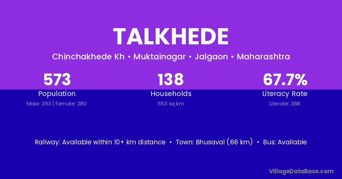 Bhusaval (66 km) is the nearest town to Talkhede village for major economic activities and is located approximately 66 km away.