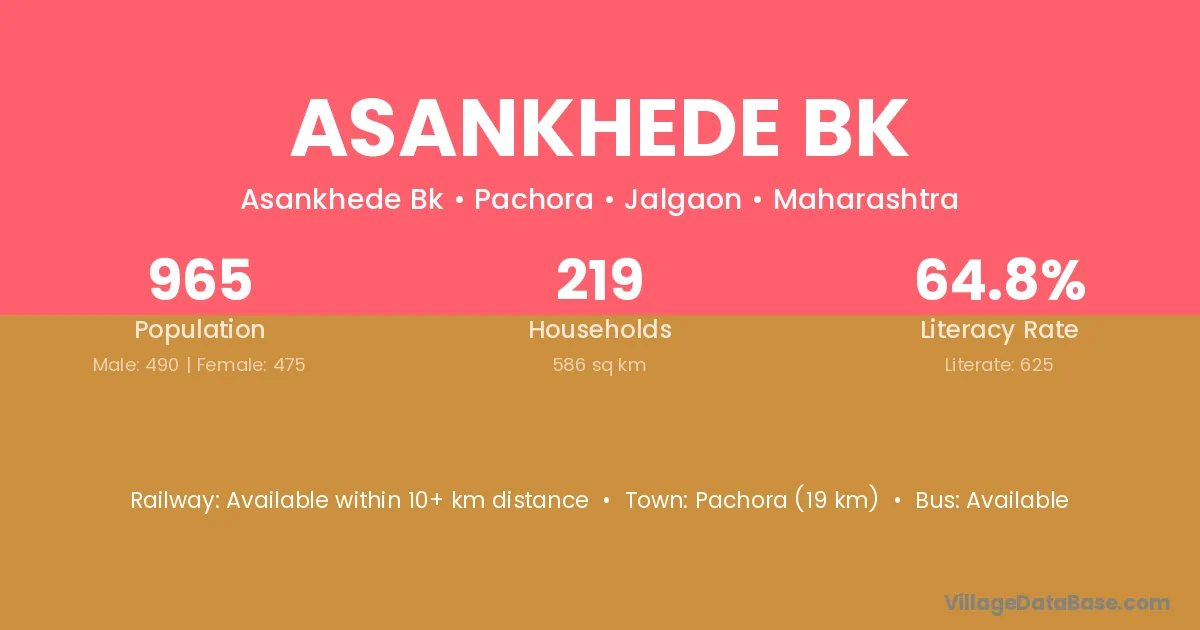 Asankhede Bk village has a total population of 965 people, of which 490 are males and 475 are females.
