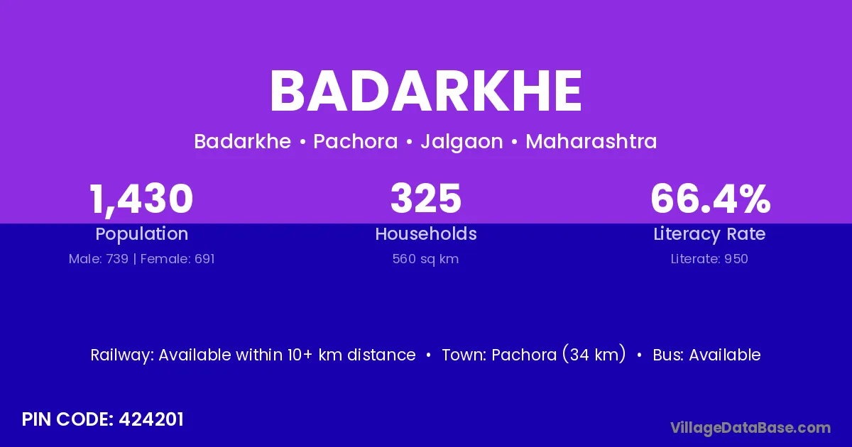 Pachora (34 km) is the nearest town to Badarkhe village for major economic activities and is located approximately 34 km away.
