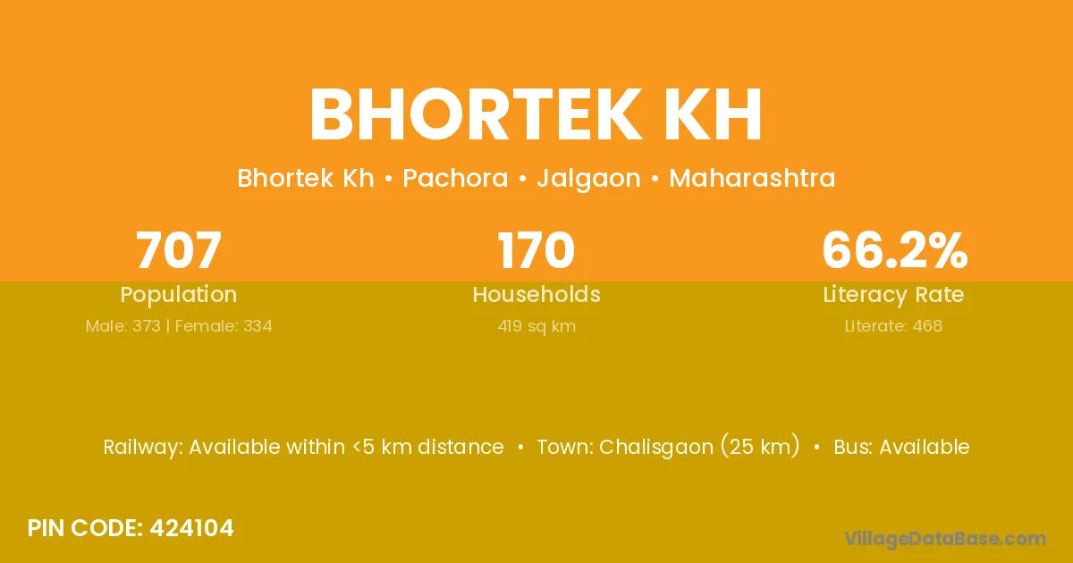 Chalisgaon (25 km) is the nearest town to Bhortek Kh village for major economic activities and is located approximately 25 km away.