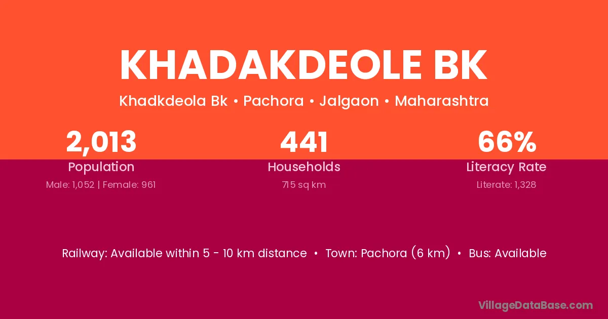 Pachora (6 km) is the nearest town to Khadakdeole Bk village for major economic activities and is located approximately 6 km away.