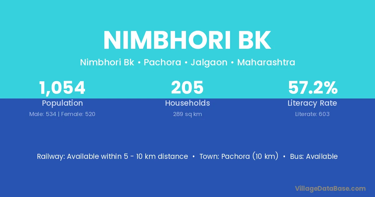 Pachora (10 km) is the nearest town to Nimbhori Bk village for major economic activities and is located approximately 10 km away.