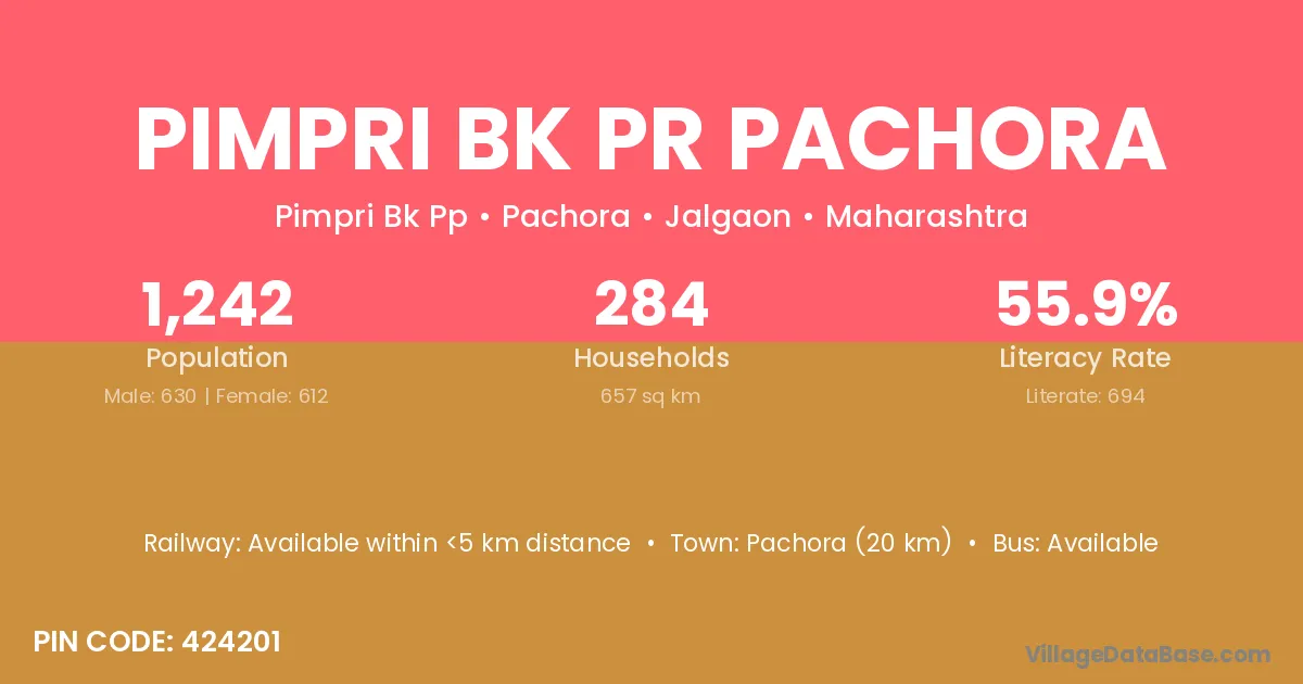 Pimpri Bk Pr Pachora village has a total population of 1,242 people, of which 630 are males and 612 are females.