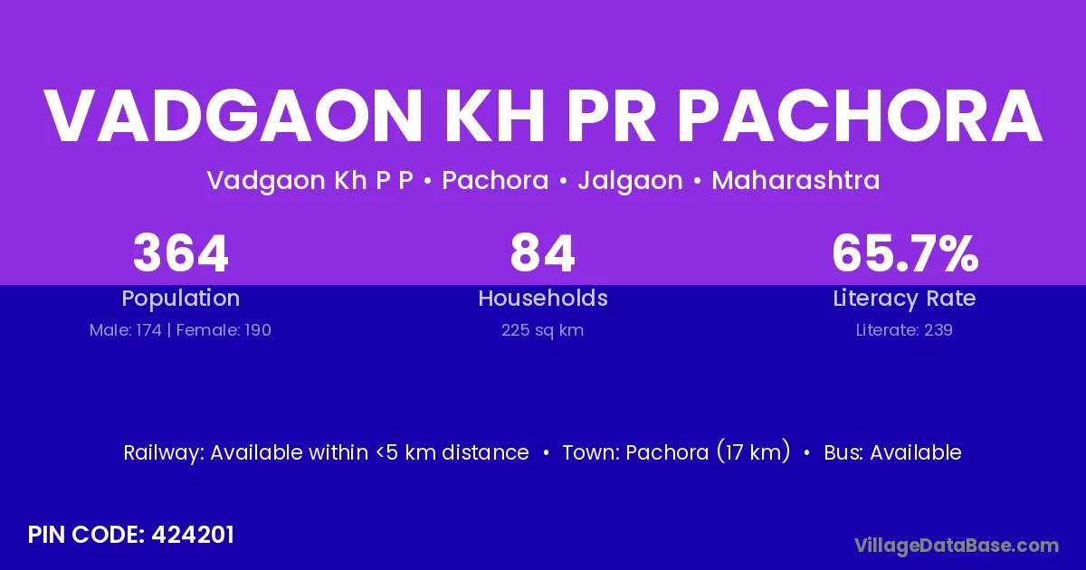 Vadgaon Kh Pr Pachora village has a total population of 364 people, of which 174 are males and 190 are females.