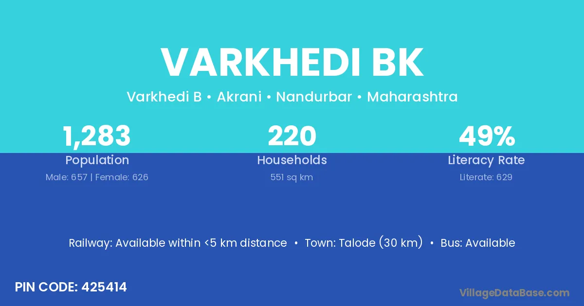 Varkhedi Bk village has a total population of 2,198 people, of which 1,148 are males and 1,050 are females.
