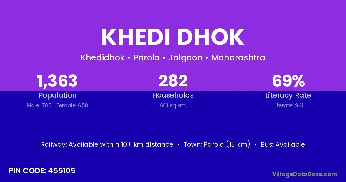 Parola (13 km) is the nearest town to Khedi Dhok village for major economic activities and is located approximately 13 km away.