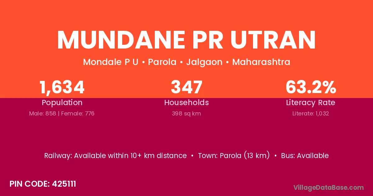 Parola (13 km) is the nearest town to Mundane Pr Utran village for major economic activities and is located approximately 13 km away.