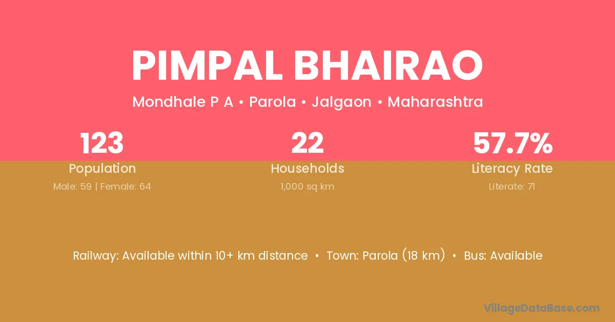 Pimpal Bhairao village has a total population of 123 people, of which 59 are males and 64 are females.