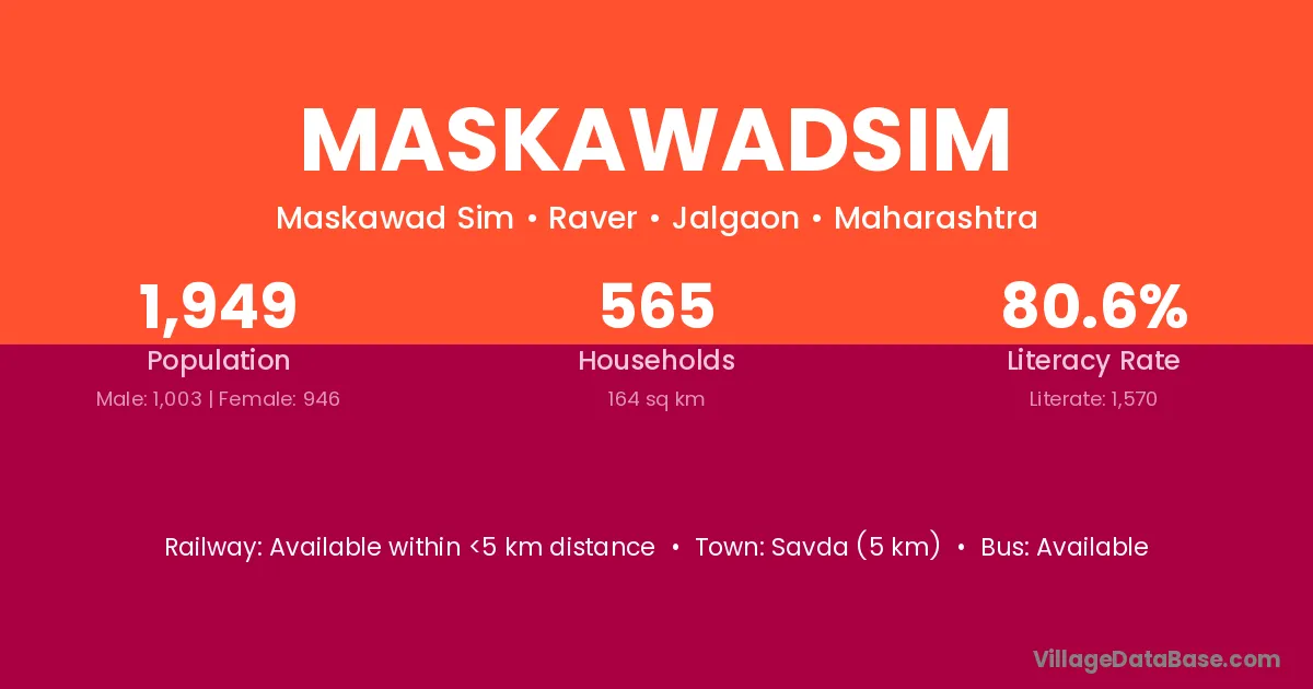 Savda (5 km) is the nearest town to Maskawadsim village for major economic activities and is located approximately 5 km away.