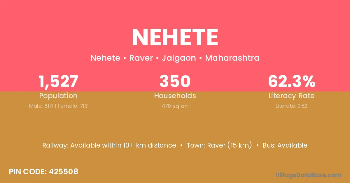 Raver (15 km) is the nearest town to Nehete village for major economic activities and is located approximately 15 km away.