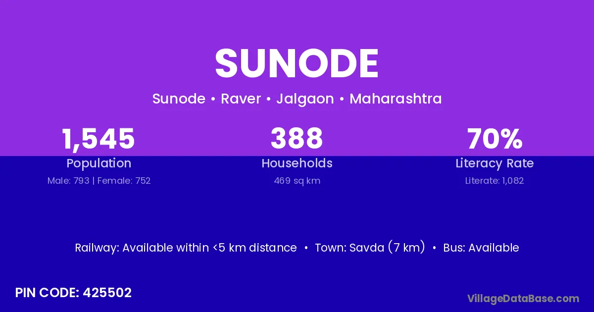 Savda (7 km) is the nearest town to Sunode village for major economic activities and is located approximately 7 km away.