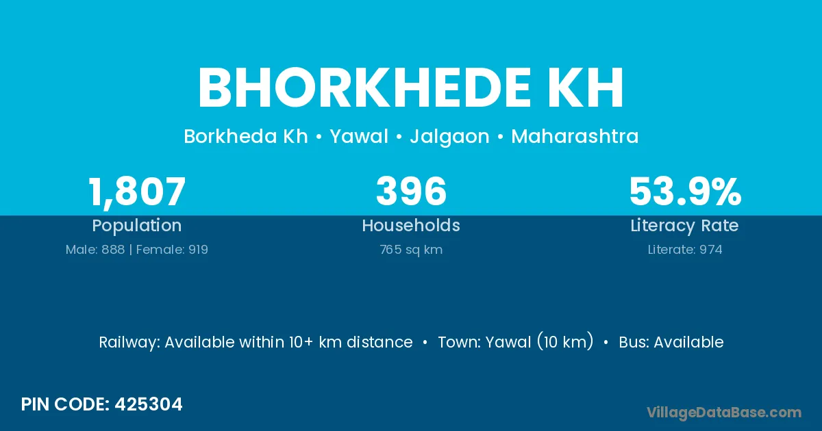 Yawal (10 km) is the nearest town to Bhorkhede Kh village for major economic activities and is located approximately 10 km away.