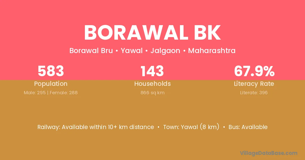 Yawal (8 km) is the nearest town to Borawal Bk village for major economic activities and is located approximately 8 km away.