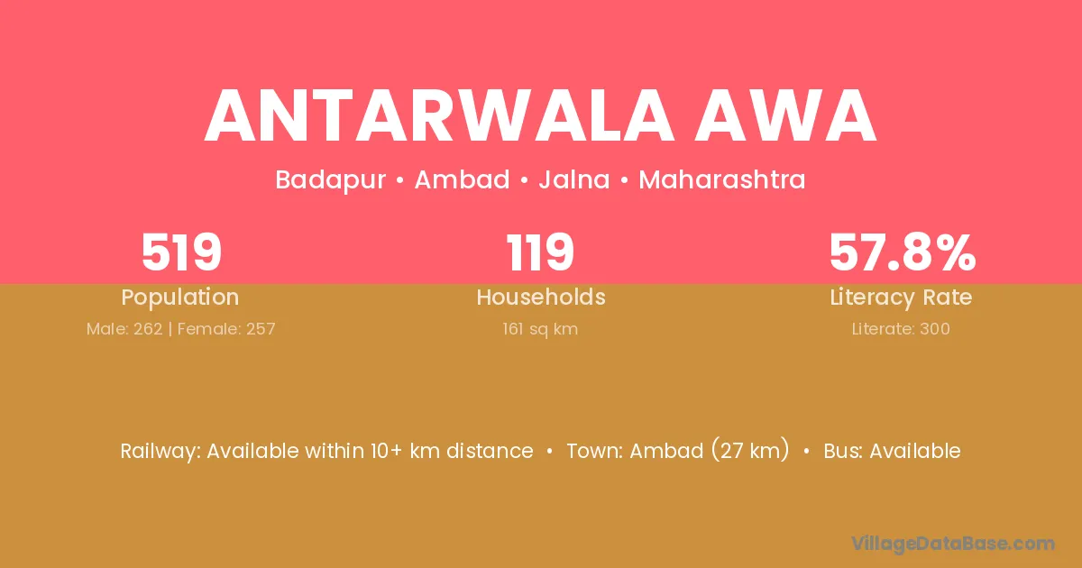 Ambad (27 km) is the nearest town to Antarwala Awa village for major economic activities and is located approximately 27 km away.