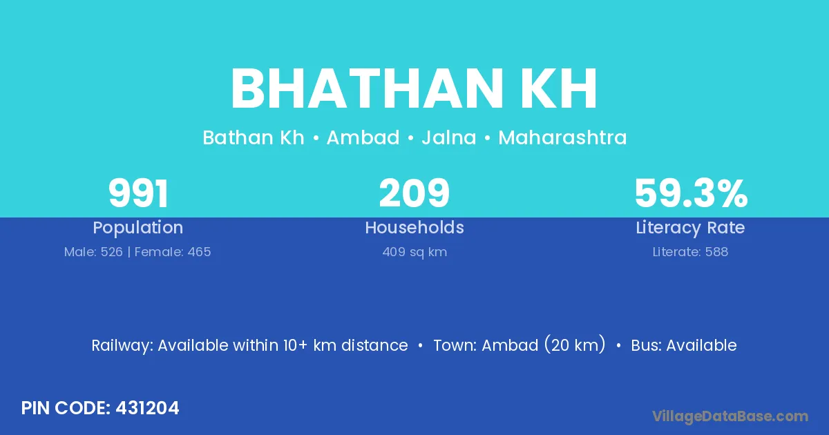 Ambad (20 km) is the nearest town to Bhathan Kh village for major economic activities and is located approximately 20 km away.