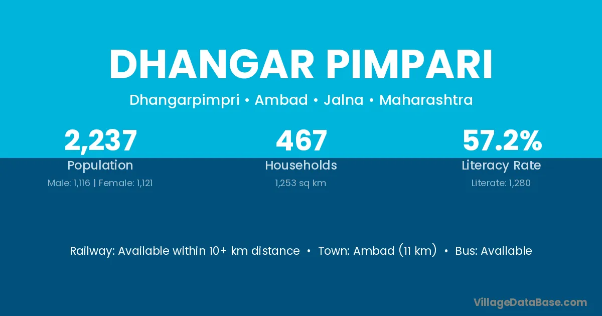 Ambad (11 km) is the nearest town to Dhangar Pimpari village for major economic activities and is located approximately 11 km away.