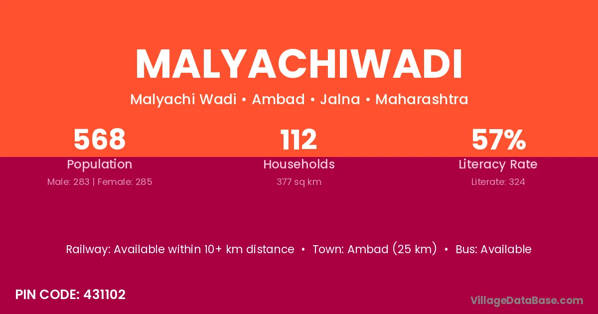 Ambad (25 km) is the nearest town to Malyachiwadi village for major economic activities and is located approximately 25 km away.