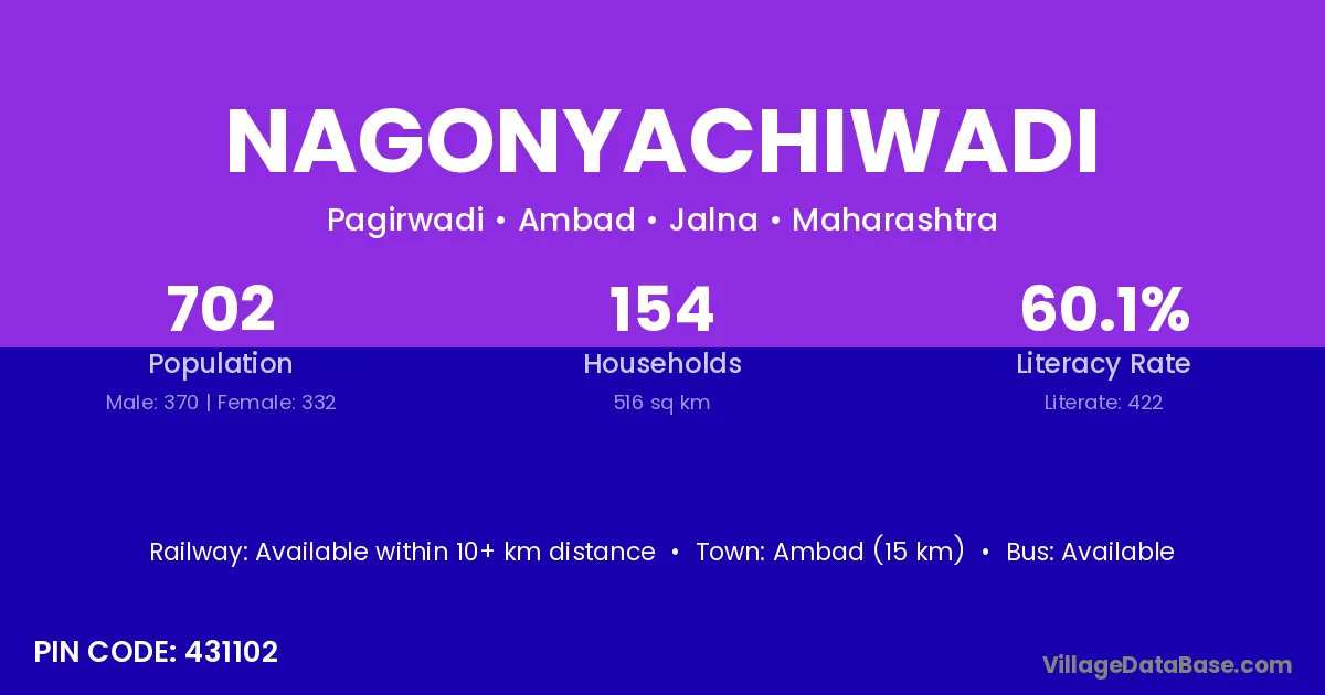 Nagonyachiwadi village has a total population of 702 people, of which 370 are males and 332 are females.