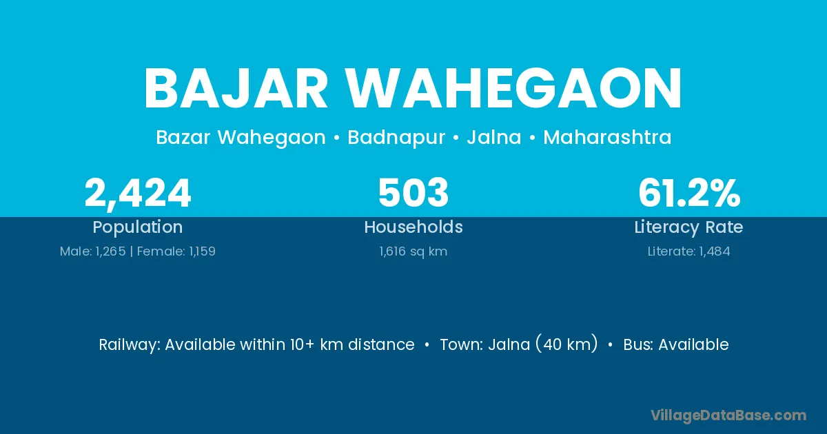 Bajar Wahegaon village has a total population of 2,424 people, of which 1,265 are males and 1,159 are females.