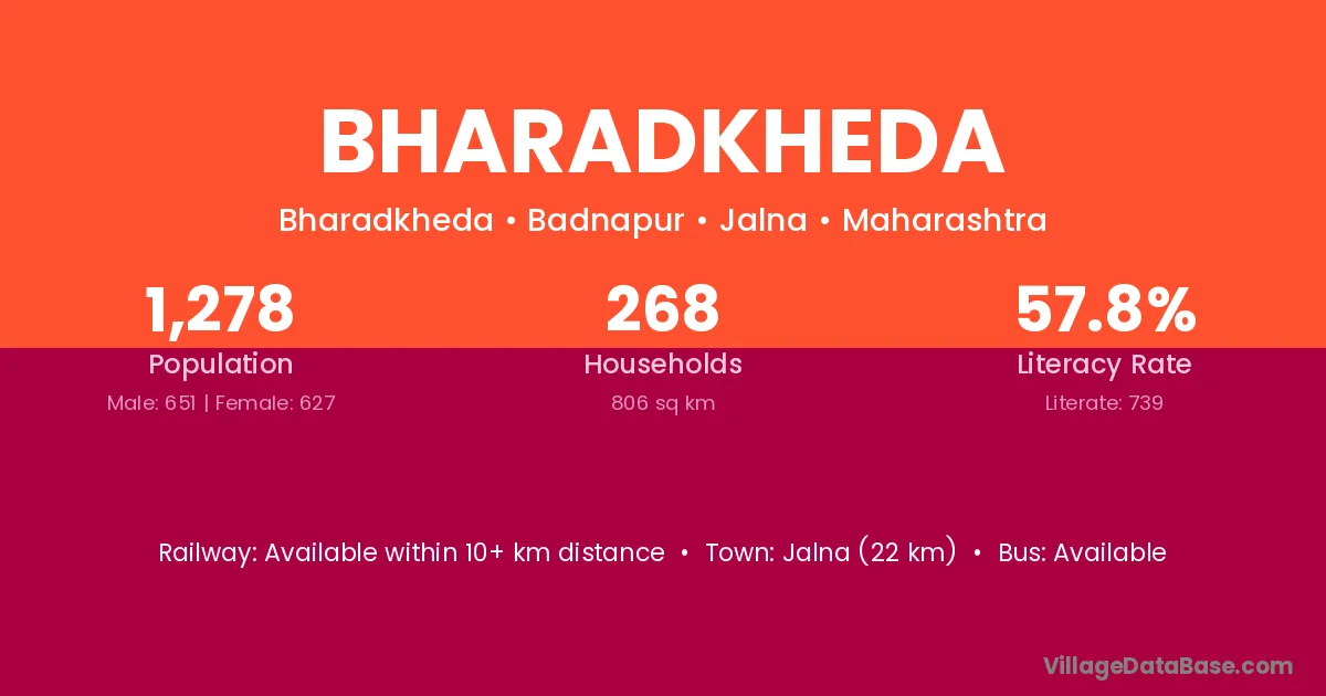 Jalna (22 km) is the nearest town to Bharadkheda village for major economic activities and is located approximately 22 km away.