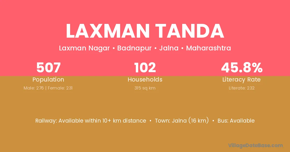 Laxman Tanda village has a total population of 507 people, of which 276 are males and 231 are females.