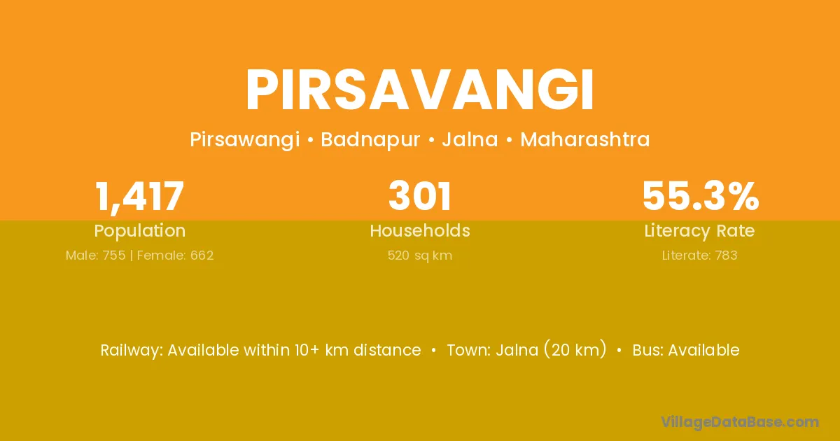 Jalna (20 km) is the nearest town to Pirsavangi village for major economic activities and is located approximately 20 km away.