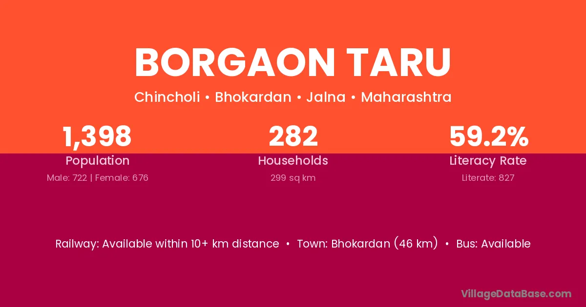 Bhokardan (46 km) is the nearest town to Borgaon Taru village for major economic activities and is located approximately 46 km away.