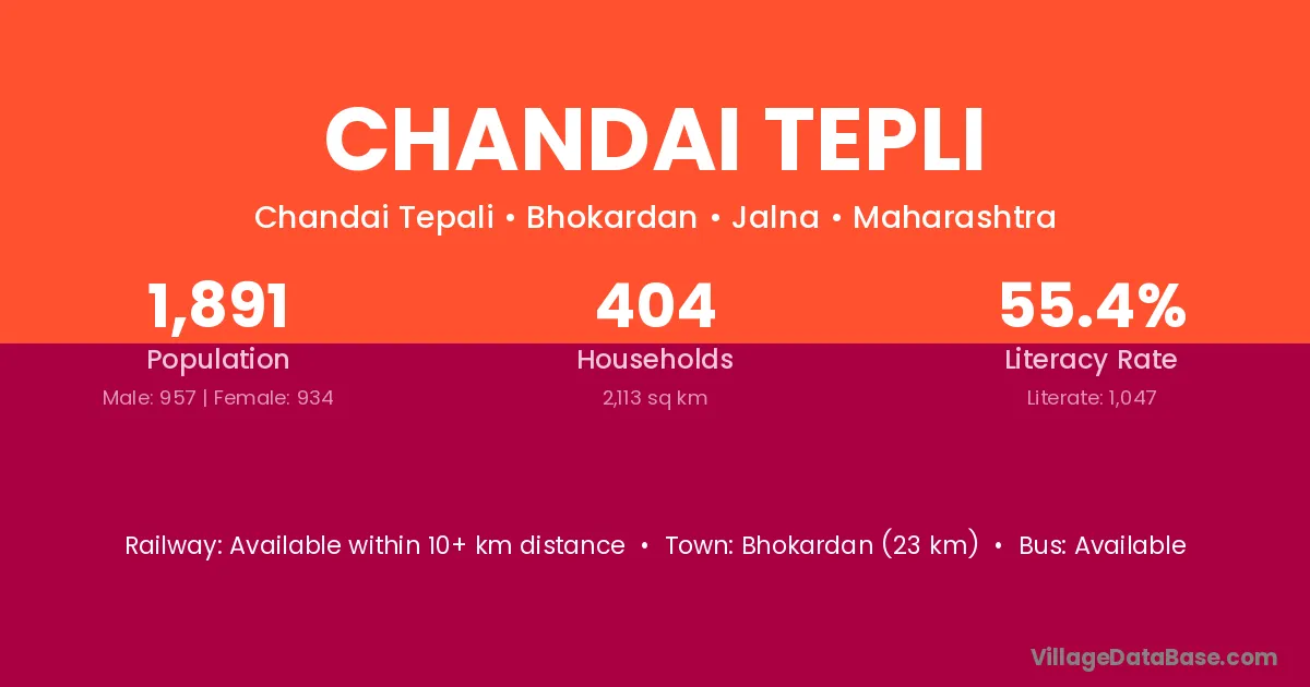Bhokardan (23 km) is the nearest town to Chandai Tepli village for major economic activities and is located approximately 23 km away.