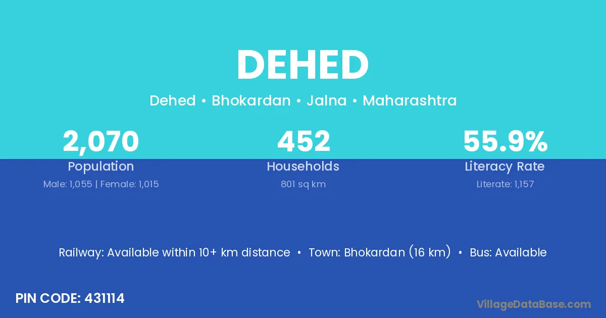 Bhokardan (16 km) is the nearest town to Dehed village for major economic activities and is located approximately 16 km away.