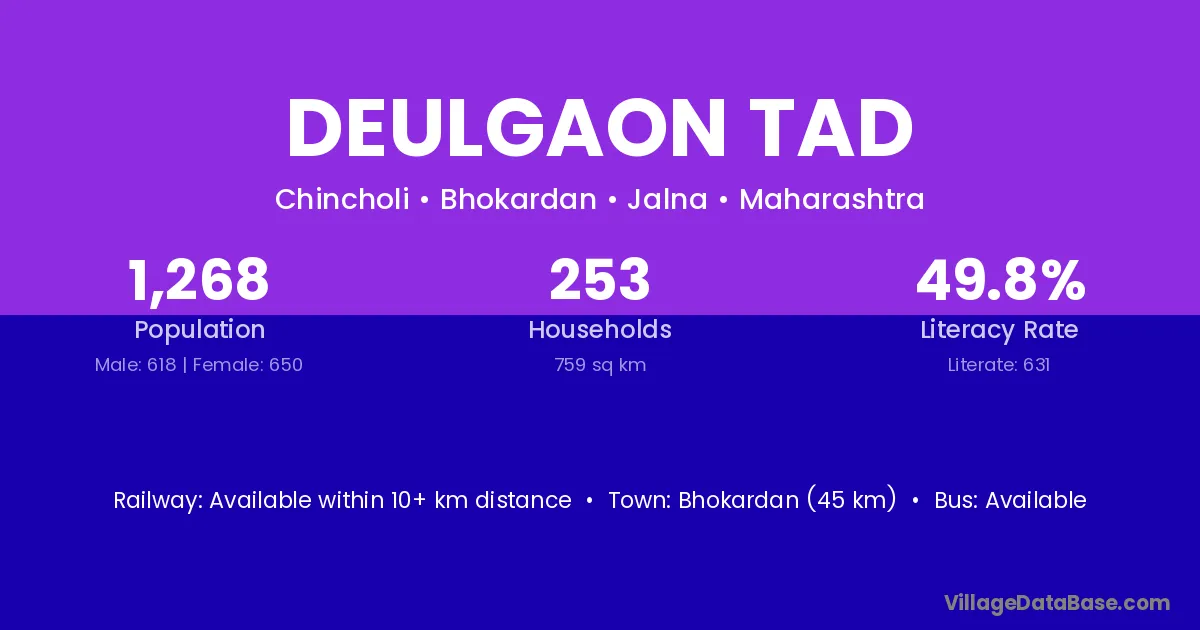 Bhokardan (45 km) is the nearest town to Deulgaon Tad village for major economic activities and is located approximately 45 km away.
