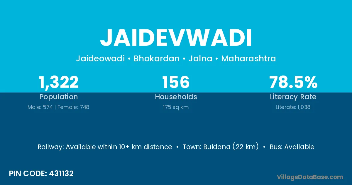 Buldana (22 km) is the nearest town to Jaidevwadi village for major economic activities and is located approximately 22 km away.