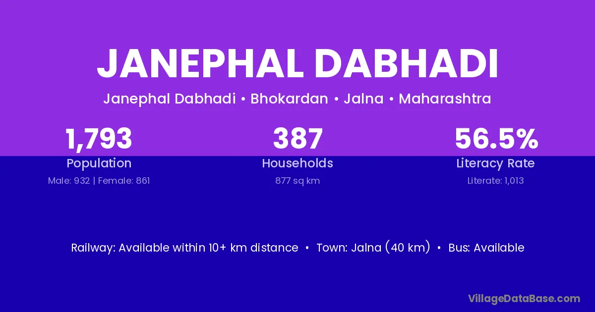 Jalna (40 km) is the nearest town to Janephal Dabhadi village for major economic activities and is located approximately 40 km away.