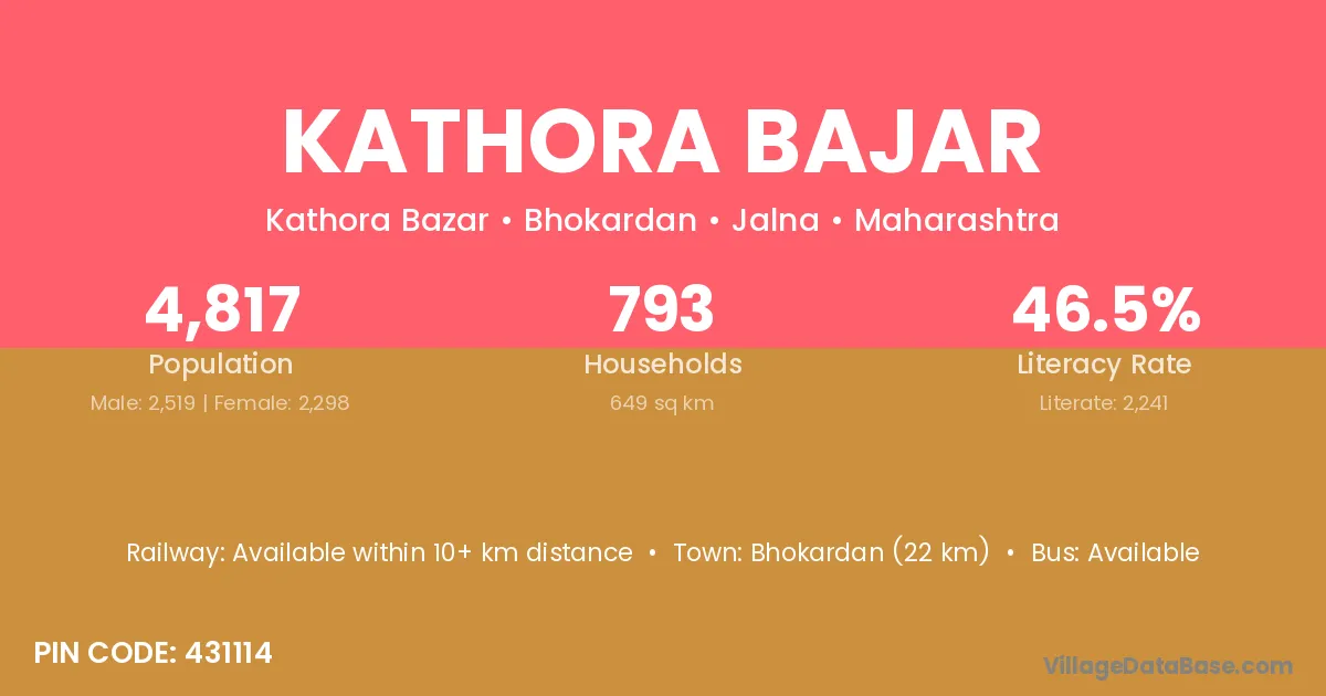 Bhokardan (22 km) is the nearest town to Kathora Bajar village for major economic activities and is located approximately 22 km away.