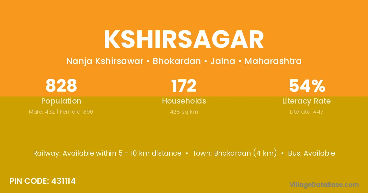 Kshirsagar village has a total population of 828 people, of which 432 are males and 396 are females.