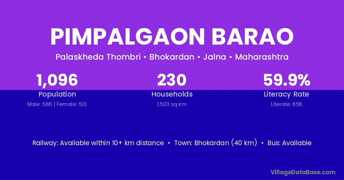 Bhokardan (40 km) is the nearest town to Pimpalgaon Barao village for major economic activities and is located approximately 40 km away.