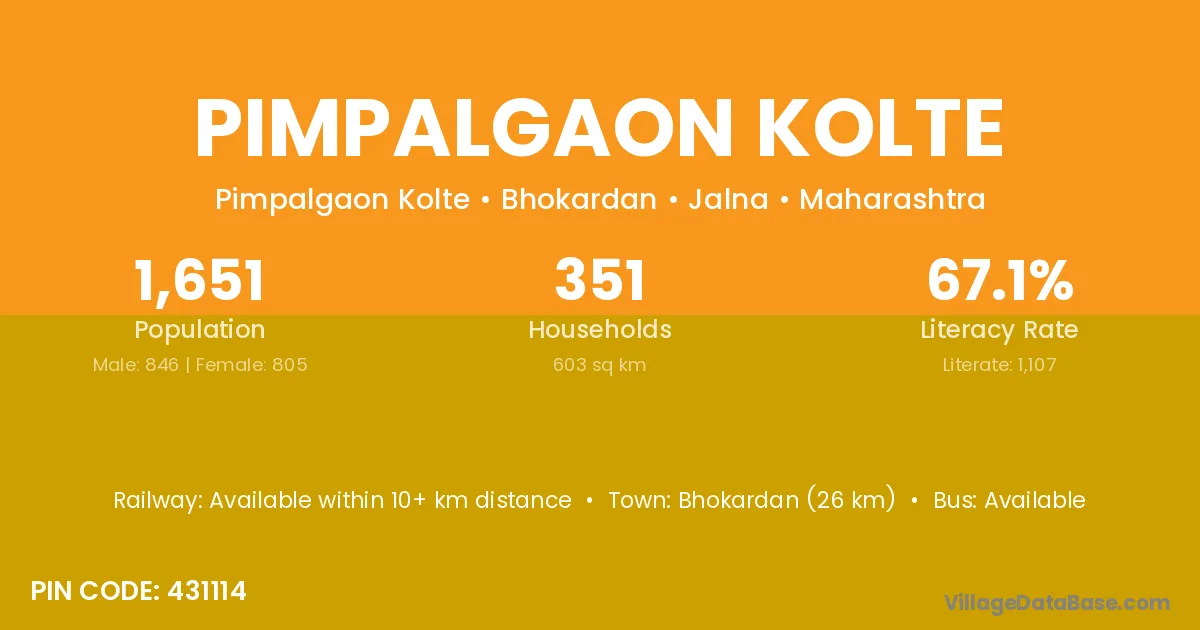 Pimpalgaon Kolte village has a total population of 1,651 people, of which 846 are males and 805 are females.
