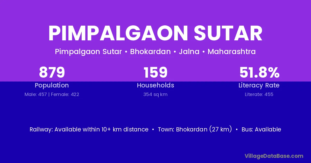 Pimpalgaon Sutar village has a total population of 879 people, of which 457 are males and 422 are females.