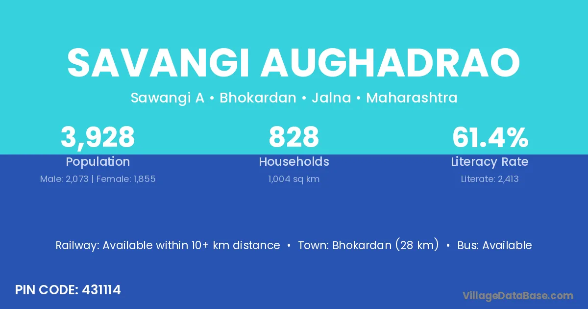 Bhokardan (28 km) is the nearest town to Savangi Aughadrao village for major economic activities and is located approximately 28 km away.