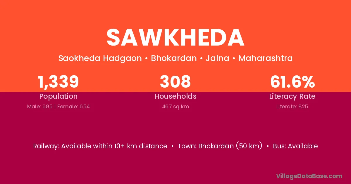 Sawkheda village has a total population of 1,339 people, of which 685 are males and 654 are females.
