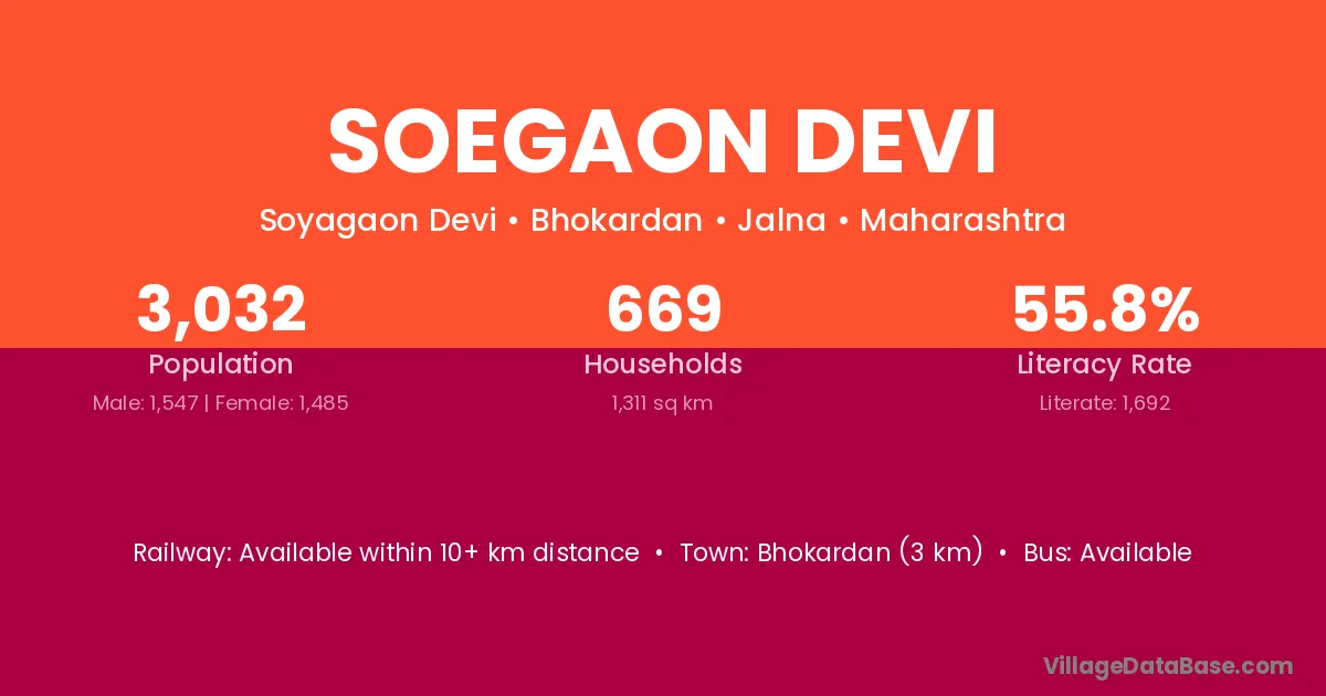 Bhokardan (3 km) is the nearest town to Soegaon Devi village for major economic activities and is located approximately 3 km away.