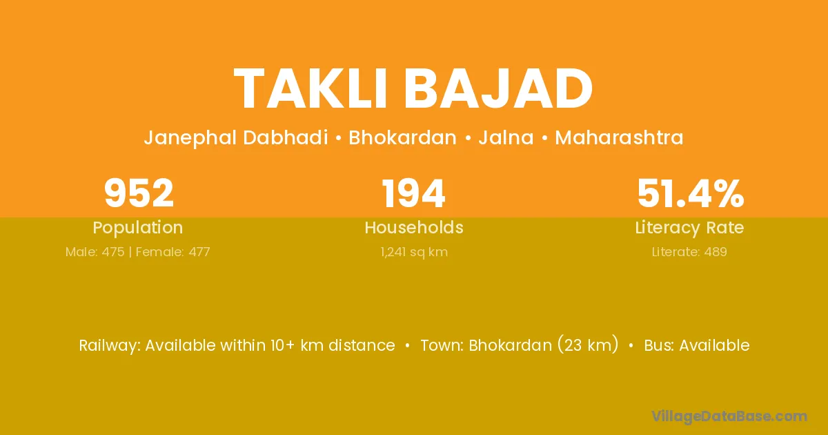 Bhokardan (23 km) is the nearest town to Takli Bajad village for major economic activities and is located approximately 23 km away.