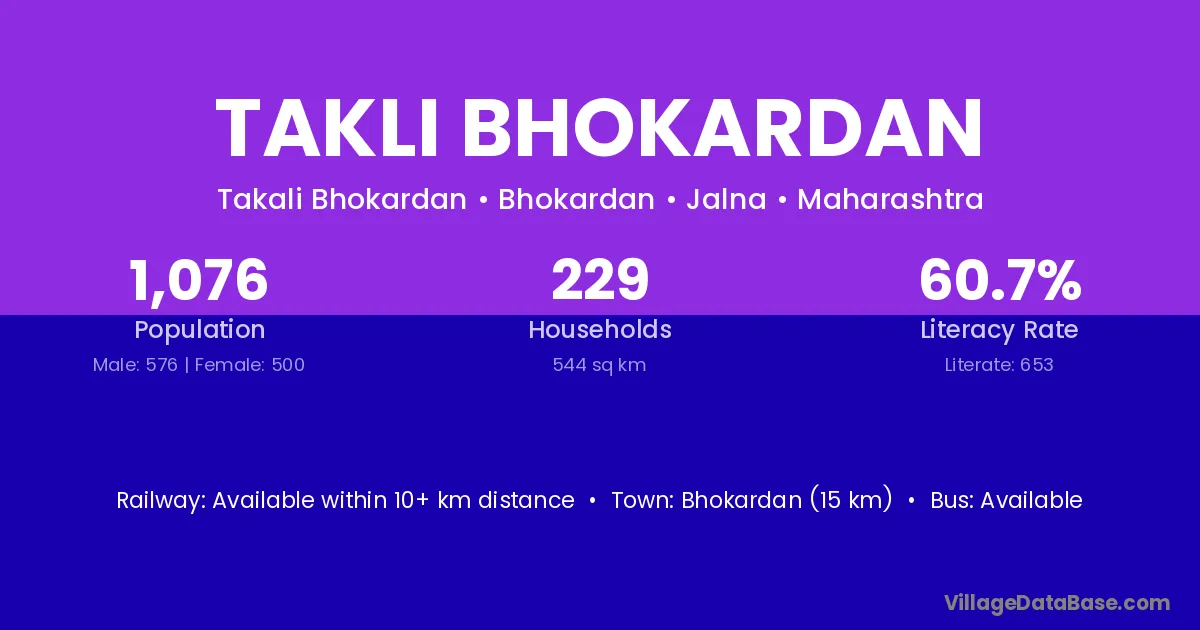 Bhokardan (15 km) is the nearest town to Takli Bhokardan village for major economic activities and is located approximately 15 km away.
