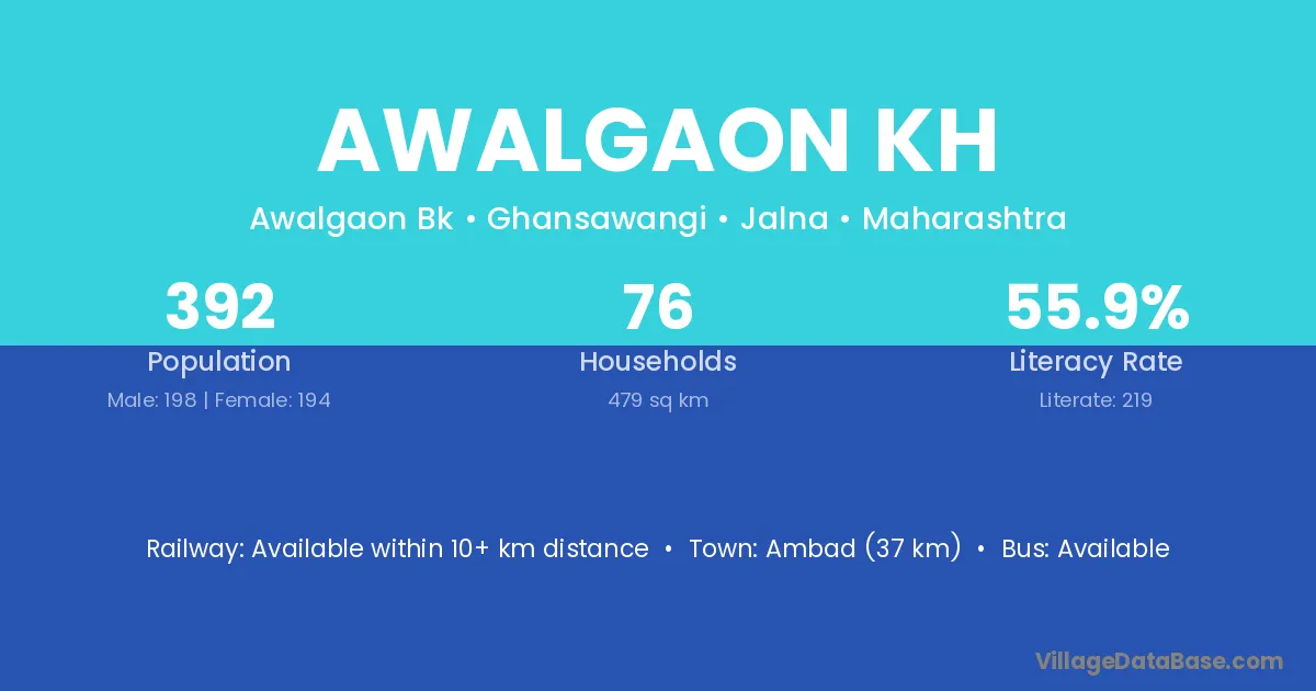 Awalgaon Kh village has a total population of 392 people, of which 198 are males and 194 are females.