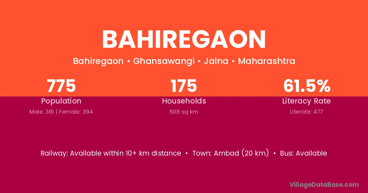 Bahiregaon village has a total population of 775 people, of which 381 are males and 394 are females.