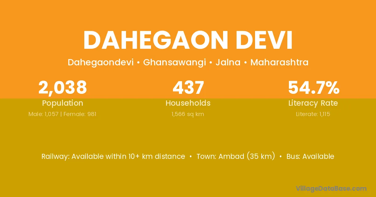 Ambad (35 km) is the nearest town to Dahegaon Devi village for major economic activities and is located approximately 35 km away.