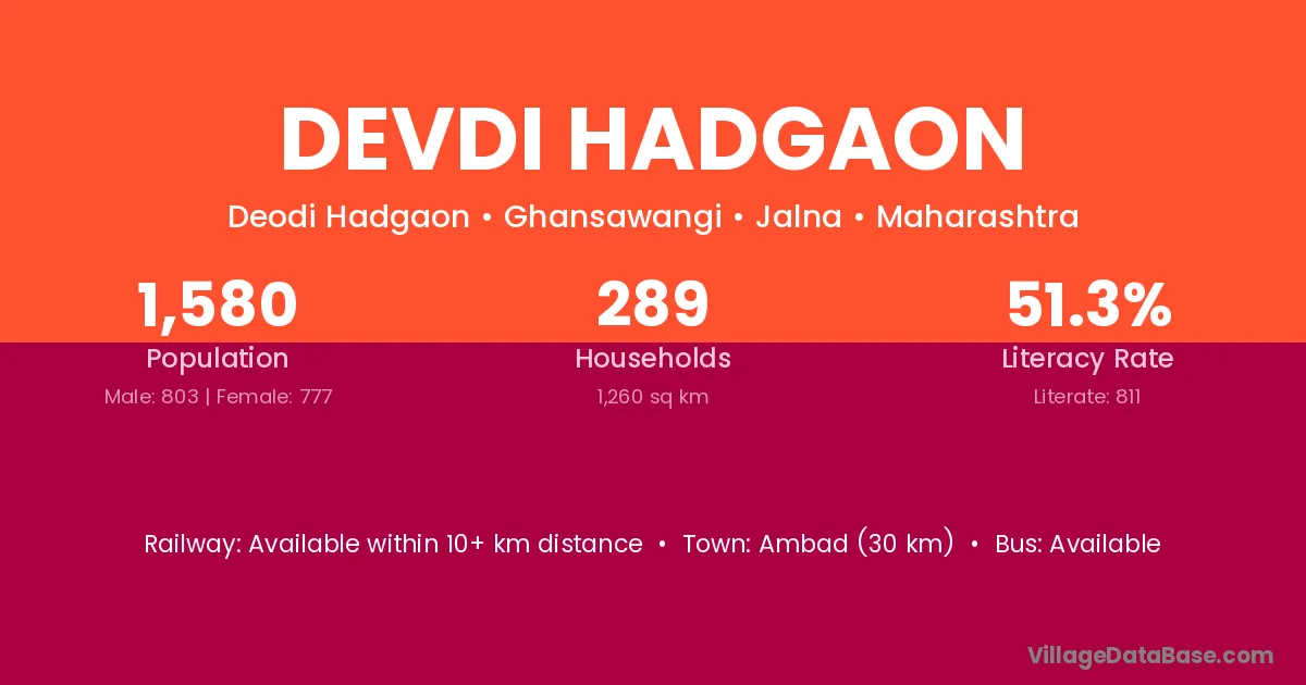 Ambad (30 km) is the nearest town to Devdi Hadgaon village for major economic activities and is located approximately 30 km away.