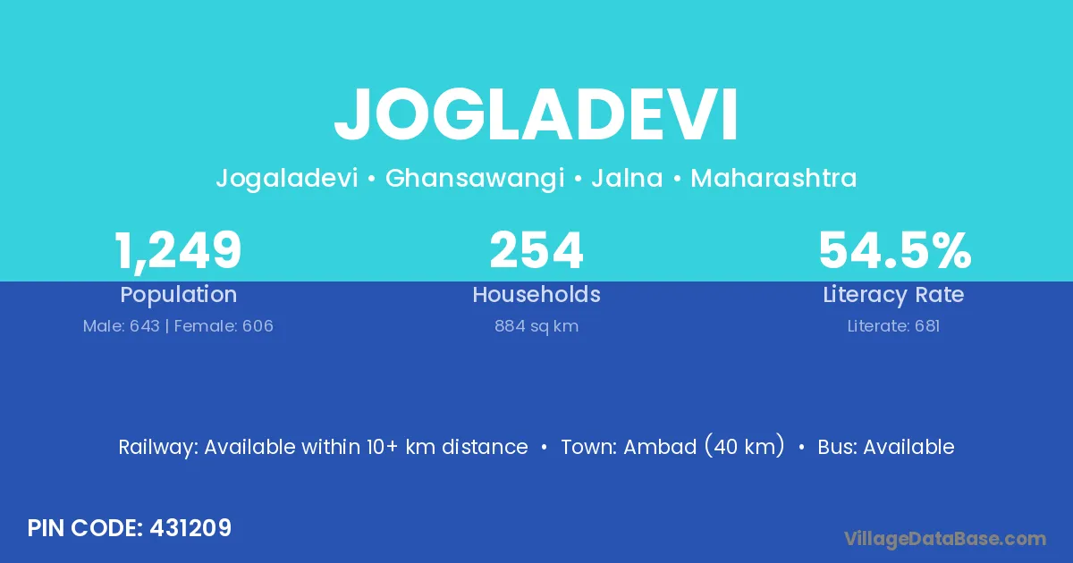 Ambad (40 km) is the nearest town to Jogladevi village for major economic activities and is located approximately 40 km away.