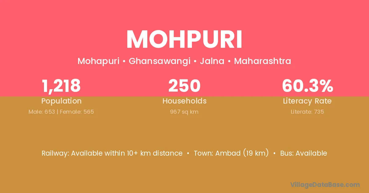 Ambad (19 km) is the nearest town to Mohpuri village for major economic activities and is located approximately 19 km away.